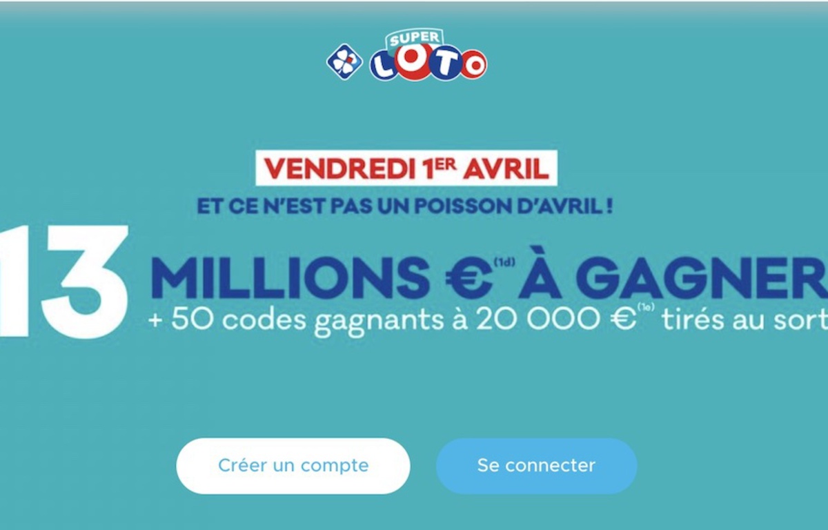 Un beau jackpot. 1 day agoCe vendredi 1er avril la Française des Jeux organise un Super Loto qui pourrait vous permettre de remporter 13 millions deuros. De quoi multiplier par cinq vos chances dempocher cette somme déjà rondelette.